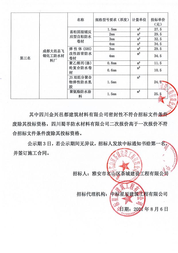 成雅新城人才公寓項目防水材料采購中標公示